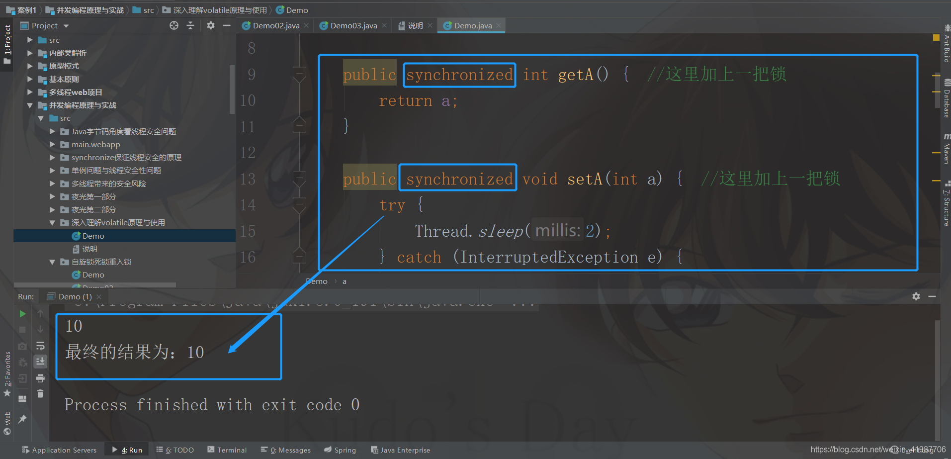 package 深入理解volatile原理与使用;//保证可见性的前提//多个线程拿到的是同一把锁,否则是保证不了的public class Demo { //volatile保证线程的一致性 public volatile int a = 1; //变量上面加上一个volatile public synchronized int getA() { //这里加上一把锁 return a; } public synchronized void setA(int a) { //这里加上一把锁 try { Thread.sleep(2); } catch (InterruptedException e) { e.printStackTrace(); } this.a = a; } //一个线程在get,另外一个线程在set,很大情况下会出现线程安全问题 public static void main(String[] args) { //我们先new一个对象出来 Demo d = new Demo(); d.a = 10; new Thread(new Runnable() { @Override public void run() { System.out.println(d.a); } }).start(); try { Thread.sleep(100); } catch (InterruptedException e) { e.printStackTrace(); } System.out.println("最终的结果为:" + d.getA()); }}