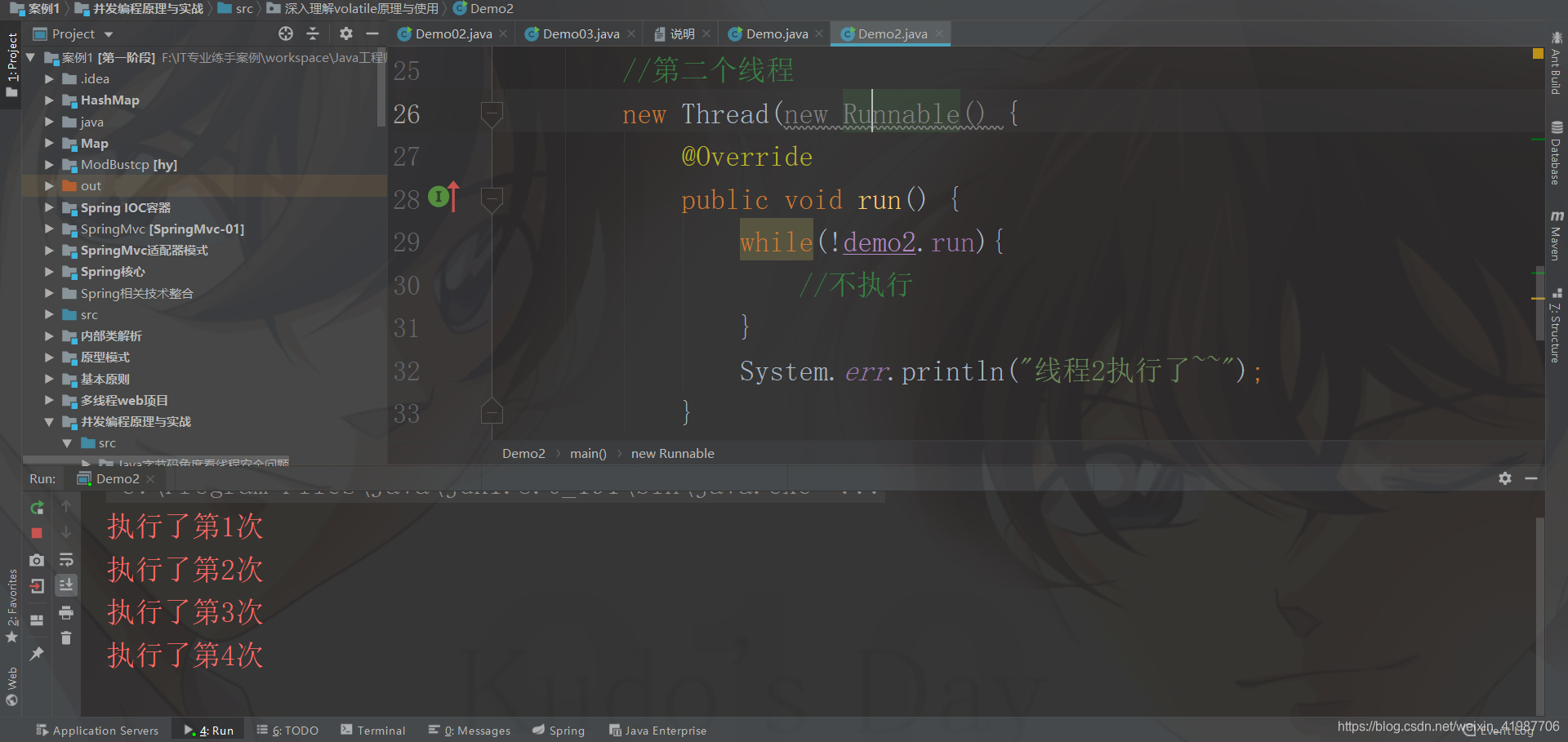package 深入理解volatile原理与使用;public class Demo2 { //volatile关键词保证一下 public volatile boolean run = false; public static void main(String[] args) { Demo2 demo2 = new Demo2(); new Thread(new Runnable() { @Override public void run() { for (int i=1;i<=10;i++){ System.err.println("执行了第" + i + "次"); try { Thread.sleep(1000); } catch (InterruptedException e) { e.printStackTrace(); } } demo2.run = true; } }).start(); //第二个线程 new Thread(new Runnable() { @Override public void run() { while(!demo2.run){ //不执行 } System.err.println("线程2执行了~~"); } }) .start(); }}