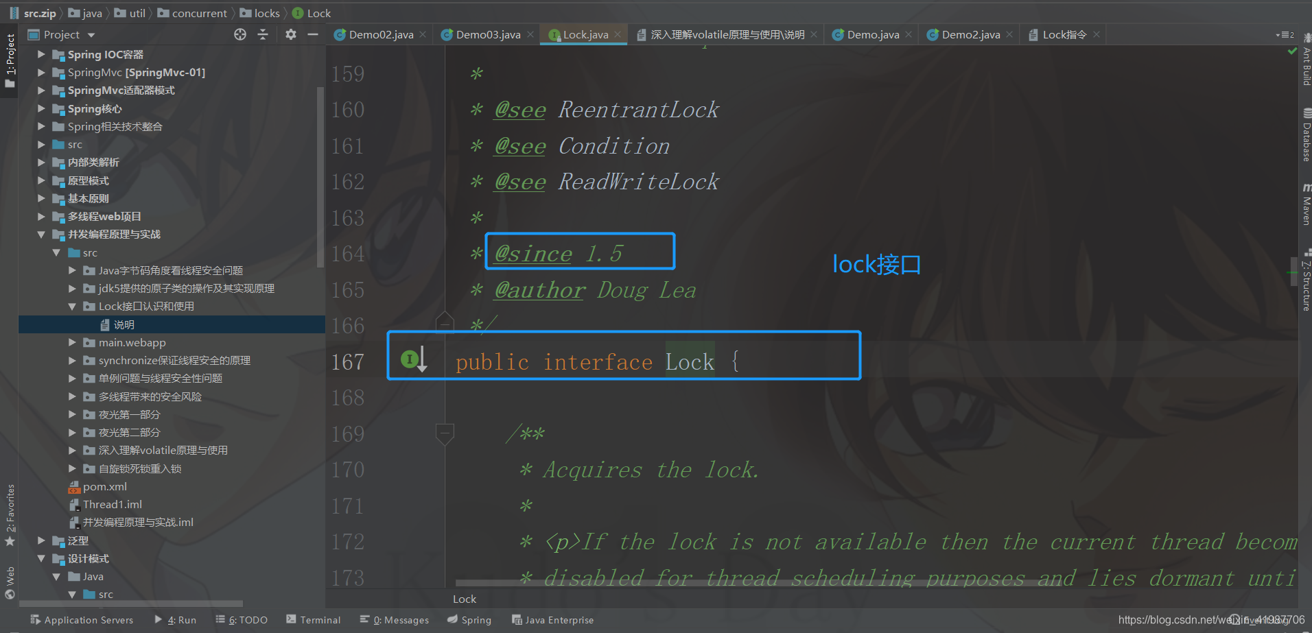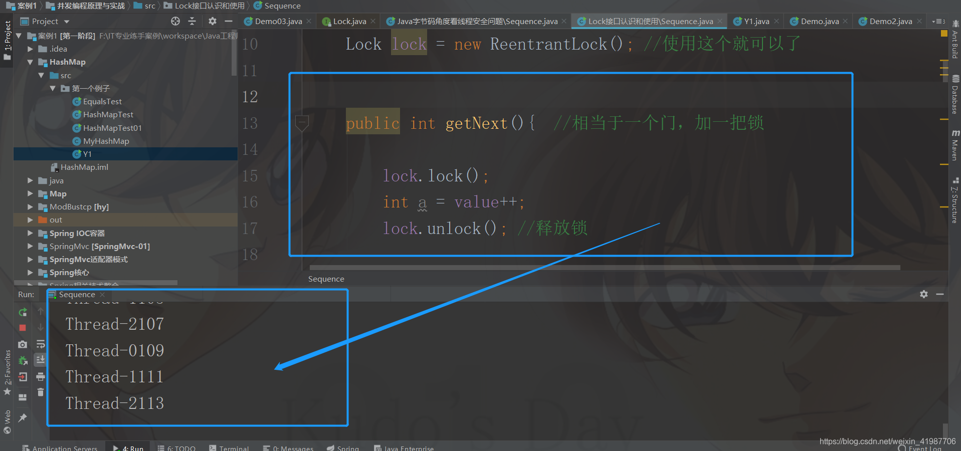 package Lock接口认识和使用;import java.util.concurrent.locks.Lock;import java.util.concurrent.locks.ReentrantLock;//夜光public class Sequence { private int value; Lock lock = new ReentrantLock(); //使用这个就可以了 public int getNext(){ //相当于一个门,加一把锁 lock.lock(); int a = value++; lock.unlock(); //释放锁 return value++; } public static void main(String[] args) { //我们调用的时候// new Sequence().getNext(); //1. 下面这种方式面对多线程,会出现不可预期的问题// Sequence s = new Sequence();// while(true){ //多次调用// System.out.println(s.getNext());// } //2. 我们看看下面这种方式 Sequence s = new Sequence(); new Thread(new Runnable() { @Override public void run() { //下面,我们不停地去调用生成器 while (true){ System.out.println(Thread.currentThread().getName() +""+s.getNext()); try { Thread.sleep(1000); //休息一会儿 } catch (InterruptedException e) { e.printStackTrace(); } } } }).start(); //然后,我们重写多个 //嗯唔 //第二个线程 new Thread(new Runnable() { @Override public void run() { //下面,我们不停地去调用生成器 while (true){ System.out.println(Thread.currentThread().getName() +""+s.getNext()); try { Thread.sleep(1000); //休息一会儿 } catch (InterruptedException e) { e.printStackTrace(); } } } }).start(); //第三个线程 new Thread(new Runnable() { @Override public void run() { //下面,我们不停地去调用生成器 while (true){ System.out.println(Thread.currentThread().getName() +""+s.getNext()); try { Thread.sleep(1000); //休息一会儿 } catch (InterruptedException e) { e.printStackTrace(); } } } }).start(); }}