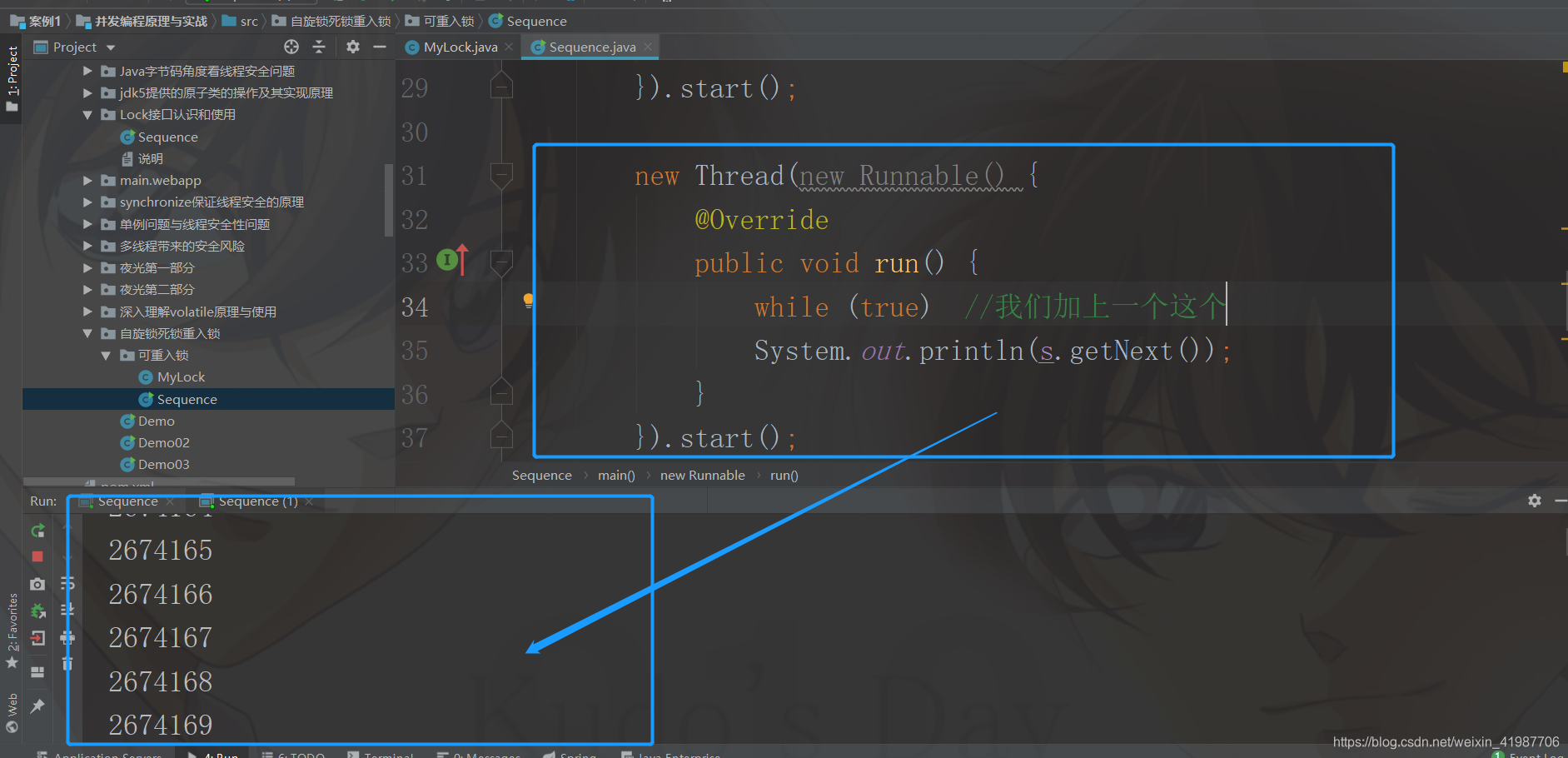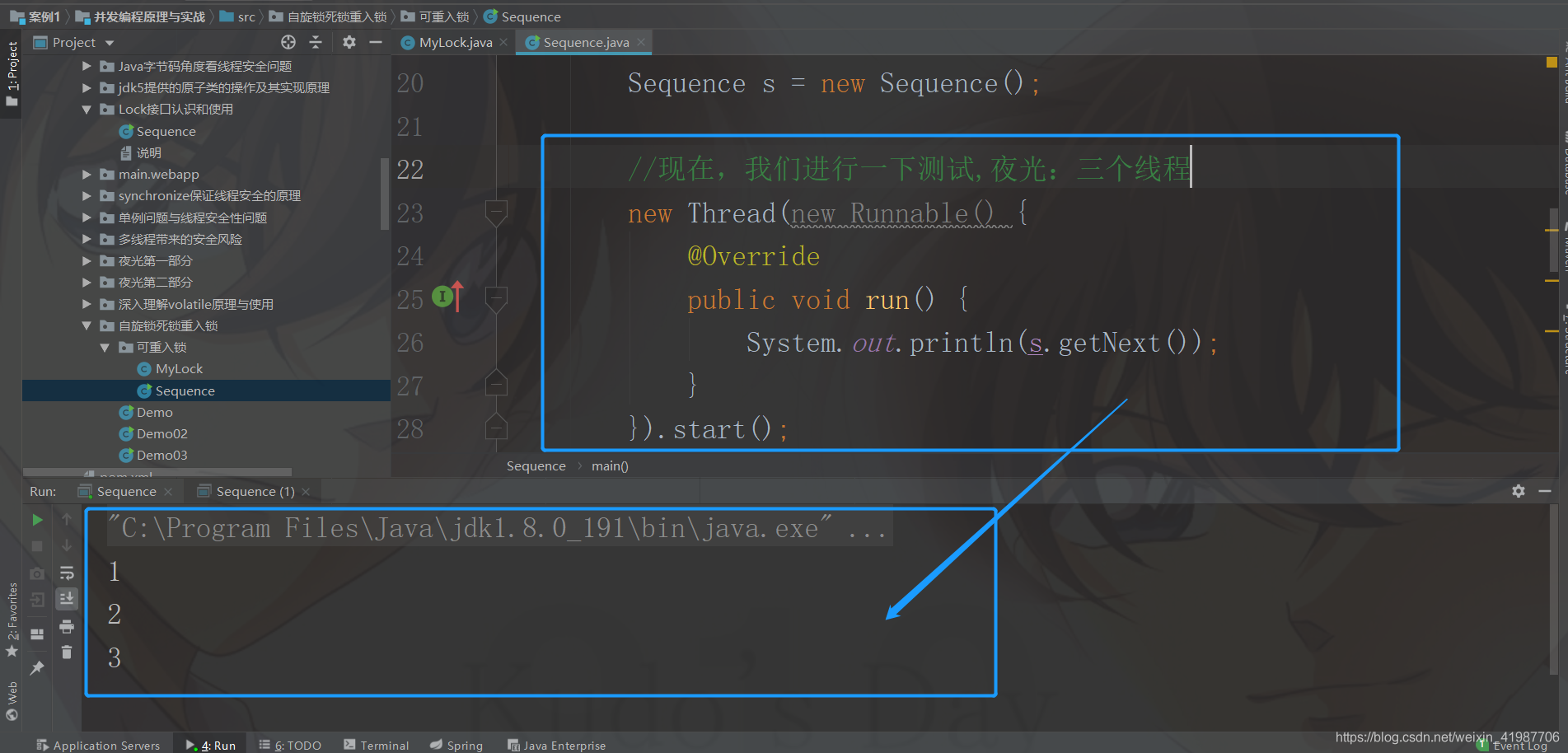 package 自旋锁死锁重入锁.可重入锁;//Sequence,我们写一个这个public class Sequence { private MyLock lock = new MyLock(); //我们先构建一下~ private int value; public int getNext(){ lock.lock(); value++; lock.unlock(); return value; } public static void main(String[] args) { Sequence s = new Sequence(); //现在,我们进行一下测试,夜光:三个线程 new Thread(new Runnable() { @Override public void run() { while (true) System.out.println(s.getNext()); } }).start(); new Thread(new Runnable() { @Override public void run() { while (true) //我们加上一个这个 System.out.println(s.getNext()); } }).start(); new Thread(new Runnable() { @Override public void run() { while (true) System.out.println(s.getNext()); } }).start(); }}