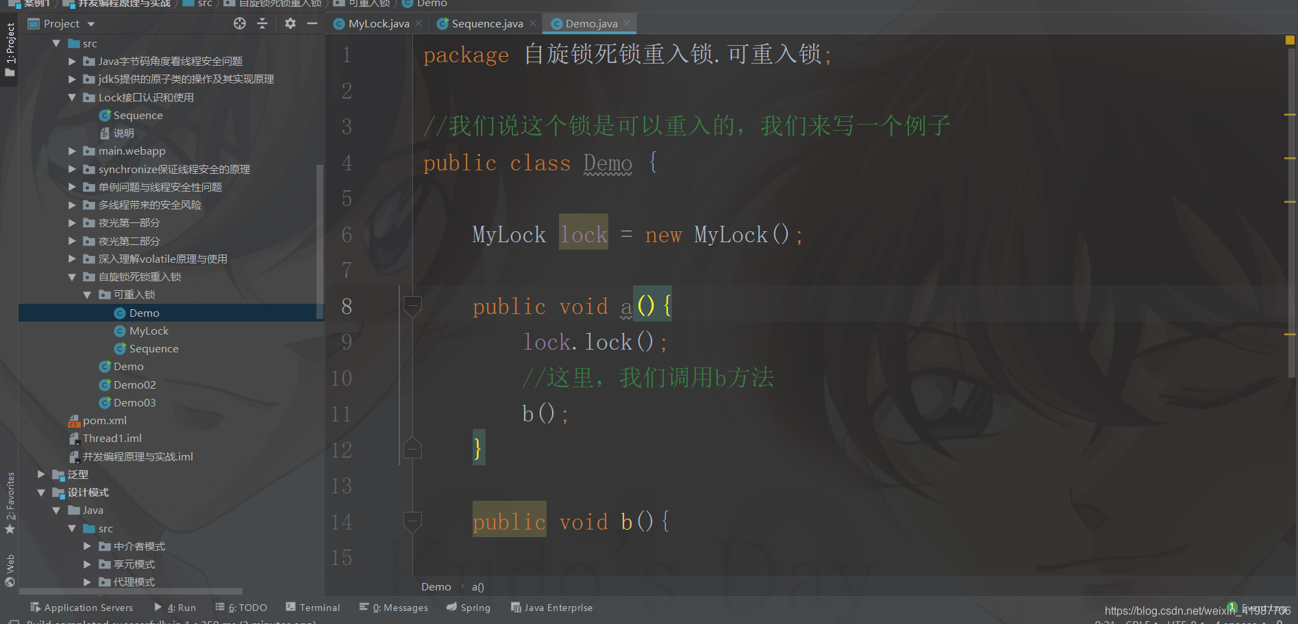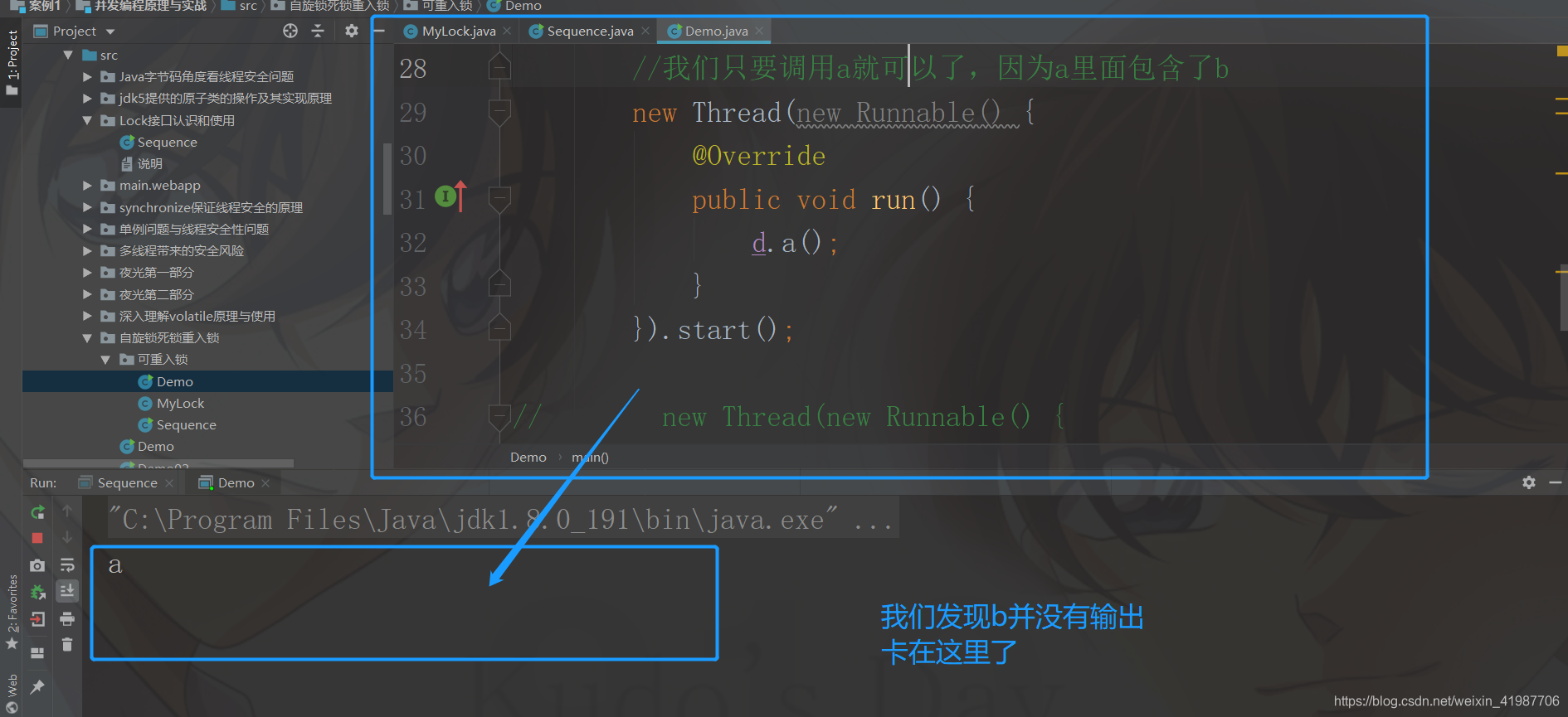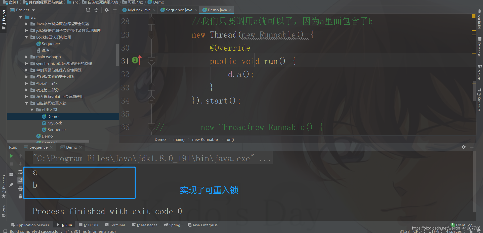 package 自旋锁死锁重入锁.可重入锁;//我们说这个锁是可以重入的,我们来写一个例子public class Demo { MyLock lock = new MyLock(); public void a(){ lock.lock(); System.out.println("a"); //这里,我们调用b方法 b(); lock.unlock(); } public void b(){ lock.lock(); System.out.println("b"); lock.unlock(); } //然后,我们来测试 public static void main(String[] args) { Demo d = new Demo(); //然后,我们来创建线程 //嗯唔 //我们只要调用a就可以了,因为a里面包含了b new Thread(new Runnable() { @Override public void run() { d.a(); } }).start();// new Thread(new Runnable() {// @Override// public void run() {// d.b();// }// }).start(); }}